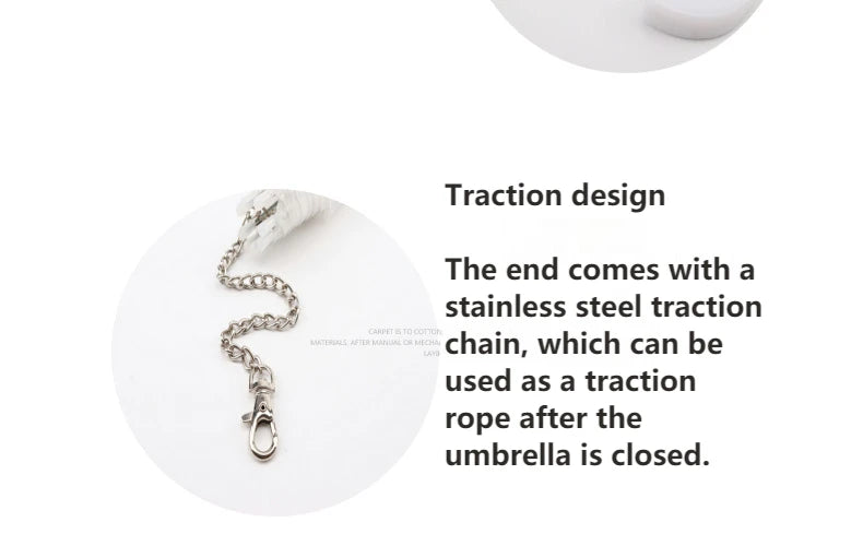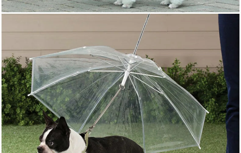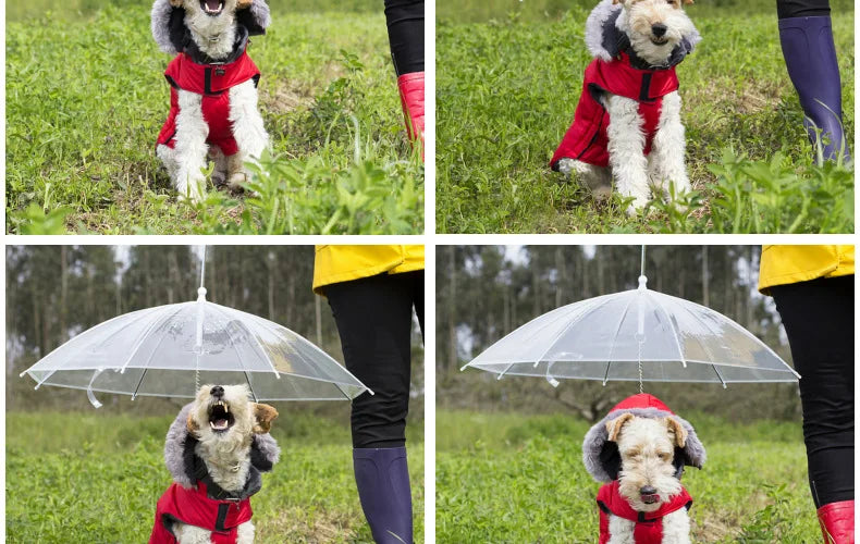 This transparent dog umbrella is designed to protect dogs from rain during outdoor walks. The clear canopy provides visibility while helping keep dogs dry in wet weather.