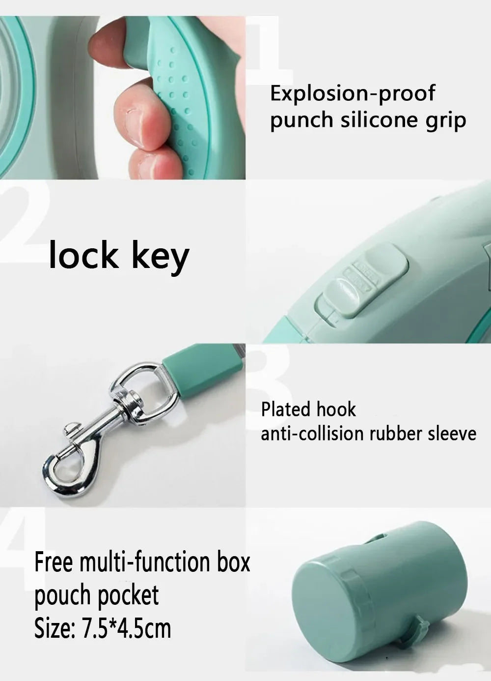 This retractable dog leash combines safety and convenience with built-in LED lighting and an integrated garbage bag holder. Designed for everyday walks, it features automatic extension for smooth movement and comfortable control.