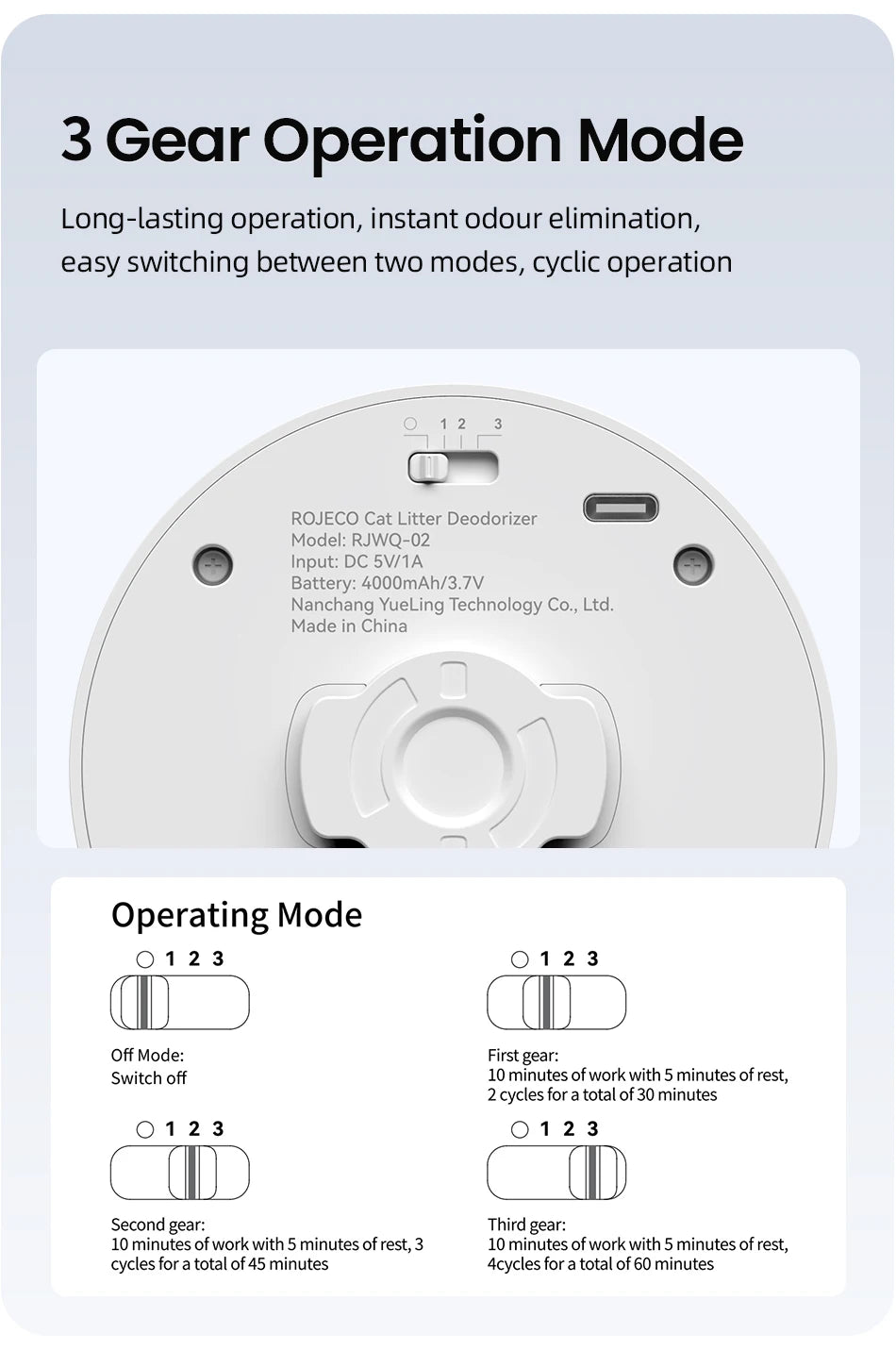 The ROJECO smart cat litter deodoriser is designed to effectively reduce unpleasant odors around the litter box. Using oxygen and negative ion purification technology, it helps improve air quality and maintain a fresher environment without fragrances or consumables.