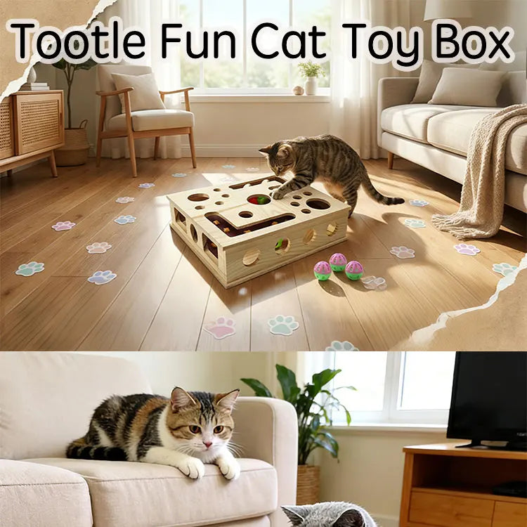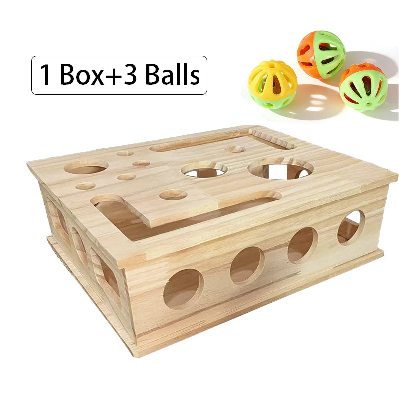 This interactive wooden puzzle box challenges your cat to think, play, and hunt for rolling balls hidden inside. The multiple holes and sliding paths stimulate curiosity and encourage problem-solving through active play.